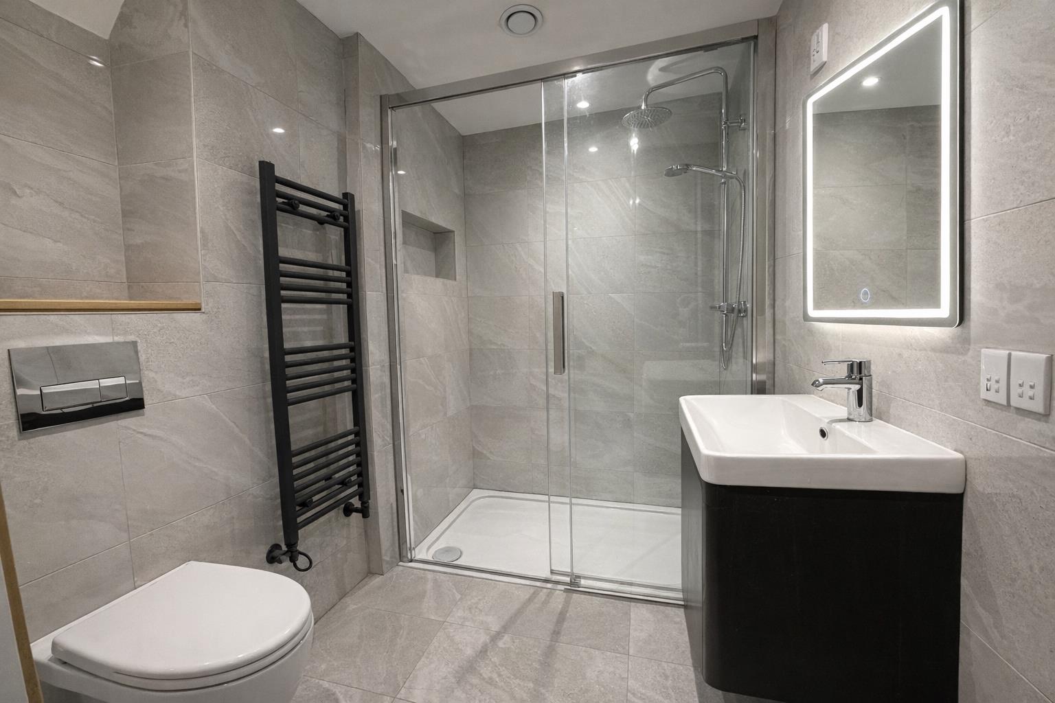 1 Reception RoomA newly completed three-bedroom duplex apartment, forming part of an impressive conversion of a former commercial building into high-quality residential accommodation. Finished to an excellent specification throughout, the property is arranged over the ground and lower ground floors and offers well-balanced, contemporary living. The property is accessed via a private entrance on the ground floor. Upon entry, there is a spacious and well-appointed shower room/WC, along with a useful storage/bike store cupboard. The first bedroom is generously proportioned and benefits from a large window, bespoke fitted wardrobes with integrated lighting, and a stylish ensuite shower room. A second double bedroom is also located on this level, again featuring built-in wardrobes and excellent natural light. A striking staircase with glass balustrade leads to the lower ground floor, where the accommodation opens into a substantial open-plan kitchen, living and dining space. This area has been thoughtfully designed for modern living and entertaining, with a high-specification kitchen incorporating integrated appliances, double oven, gas hob and extractor, complemented by feature lighting including both uplighting and downlighting to the units. Large sliding doors provide an abundance of natural light and lead directly onto a private patio area, creating a seamless indoor-outdoor connection. Also on the lower ground floor is a contemporary family bathroom, finished with high-quality tiling and fittings, along with a third double bedroom featuring fitted wardrobes with integrated illumination. Throughout the property, there is herringbone flooring with underfloor heating, alongside modern systems for heating, hot water and fire safety, ensuring both comfort and efficiency. Please note that as a newly completed conversion, Council Tax and EPC ratings are yet to be confirmed. *some furniture has been digitally added